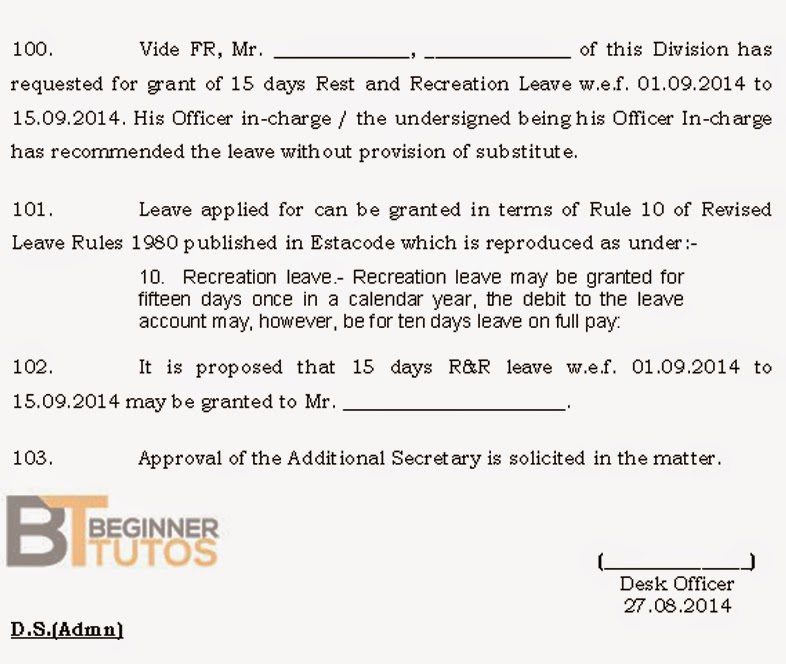 While working in Administration Branch of a Ministry, you often get requests from the Officers regarding grant of leave for a period of particular days. The Officer sends his request in either hand written form or typed form. Soon after receiving the request, it has been examined in all aspects i.e. availability of leave in the credit of the Officer, provision of substitute during the leave period and to see that if the leave is falling under the rules. In the routine, it mostly does. So we don't really need to worry about that. As usual, it is first put up on file by the Section for approval of the competent authority.